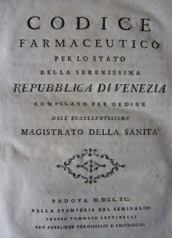Codice Farmaceutico della Repubblica di Venezia Importantissima opera stampata per ordine del magistrato della Sanità di Venezia e indirizzata al popolo della repubblica di Venezia. L'opera dopo essere stata fortemente voluta fu subito ritirata in quanto giudicata "pericolosissima per la salute degli uomini" perchè piena di errori che avrebbero tratto in inganno gli speziali. Da qui la sua rarità assoluta Autore : Magistrato della Sanità di VeneziaEditore : Stamperia del Seminario Tommaso BettinelliAnno di pubblicazione : 1790 Note dell'Autore
