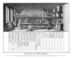 Enciclopedia o Dizionario ragionato delle arti, scienze e mestieri La Tavola delle Affinità qui riportata con l'immagine del laboratorio appartiene alle Planche de La Chimie dell'Enciclopedia di Diderot d'Alambert che fu la prima grande enciclopedia illuministica. All'opera parteciparono più di 160 scrittori,filosofi ed illustratori e subì differenti arresti nella sua pubblicazione.Infatti, dopo la prima uscita nel 1751,solo un volume fu pubblicato e i successivi ripresero ad essere emanati solo nel 1759 e con il 1772 l'Enciclopedia venne ultimata. D'Alambert, per protesta, abbandonò nel 1759 il progetto che fu concluso da Diderot. Autore : Denis Diderot Jean Le Rond d\\\'AlambertEditore : Chez Briasson ed altri ParisAnno di pubblicazione : 1751-1772 Approfondimenti Tabula Affinitatum inter differentes substantias La Tavola delle affinità chimiche costituisce lo schema sintetico e sistematico dei rapporti di combinazione fra diverse sostanze reagenti. La Tavola è suddivisa in colonne nelle quali sono inserite le sostanze aventi un grado d'affinità decrescente rispetto alla prima. In essa le sostanze sono riprodotte con simbologia di origine alchimistica pur avendo, il simbolo, perso la connotazione mistica o metafisica che spesso possedeva nel contesto alchemico. L'abbreviazione sta quindi ad indicare, esclusivamente ed in maniera univoca una sostanza in particolare o una classe di sostanze. Il primo ad elaborarla, nel 1718, fu Etienne François Geoffroy e da quella poi ne derivarono altre in cui apparvero delle aggiunte e modifiche. La stampa, qui riprodotta, è stata eseguita in originale dall'incisore Prevost per la prima edizione (Edizione di Parigi in folio) della Encyclopedie di Diderot D'Alembert -Planche de la Chimie e raffigura: nella parte alta il tipico laboratorio chimico della fine del XVIII secolo e, nella parte bassa, la Tavola dei Rapporti di Geoffroy. Si riconoscono all'interno delle colonne il simbolo dell'oro (cerchio con un punto nel centro - simbolo anche del Sole), il simbolo dell'argento (la Luna), la corona (Regolo d'antimonio "“ Antimonio tricloruro), il segno dello stagno (anche segno della parola latina Recipe "“ in italiano prendi "“ che stava all'inizio di ogni ricetta negli antidotari), il simbolo dell'acido (primo segno in alto a sinistra), il simbolo del piombo (la croce con un'ansa incompleta a destra), l'acqua (raffigurata con il triangolo a punta in giù), lo spirito di vino o alcool (la V contenente la S), l'aceto distillato (la croce che divide lo spazio in quattro quadranti contenenti un punto), lo zinco (rappresentato dalla zeta con un tratto trasversale sul ramo del piede), la terra (triangolo con la punta riversa verso il basso e tagliata da una linea orizzontale), le sostanze metalliche (raffigurato dalle lettere SM) e così tanti altri . La tavola ebbe una grande diffusione per tutto il XVIII secolo preludio del più scientifico Sistema periodico degli elementi di Dmtrij Ivanovic Mendeleev che apparve la prima volta il 1° Marzo 1869 sotto il nome di "Abbozzo di un sistema degli elementi, basato sul loro peso atomico e sull'affinità chimica" Note sull'autore Denis Diderot Denis Diderot nasce il 5 ottobre 1713 a Langres, una cittadina di provincia, da una famiglia borghese benestante. Dopo il percorso della scuola primaria si trasferisce a Parigi dove compie gli studi universitari laureandosi nel 1732. A Parigi Diderot conosce Jean Jacques Rousseau con il quale avrà un rapporto complicato, ma duraturo. Per guadagnarsi da vivere svolge il lavoro di traduttore e scrittore pubblicando alcune opere che lasciano intravedere la sua personalità intellettuale libera e aperta. Alcuni di questi scritti furono considerati sovversivi e per questo Diderot passò un breve tempo in carcere. La grande avventura dell'Enciclopedia è già iniziata e lo terrà occupato per ben quindici anni dopo la defezione di D'Alembert nel 1759. Conduttore di una vita disordinata, soprattutto dovuta a difficoltà economiche, Diderot si dibattè per sopravvivere cercando aiuti ovunque. Caterina II di Russia fu una sua benefattrice acquistandogli la biblioteca che gliene lasciò l'uso per compiere il proprio lavoro. Per questo Diderot accettò l'invito a Pietroburgo dove soggiornò per un certo periodo. Abile conversatore godette della stima di molti amici fra cui Voltaire con il quale fondò la base del pensiero illuminista. . Il pensiero libero e sensibile risultò più moderno dei propri tempi portandolo su posizioni filosofiche in cui si affermava, ad esempio, che le intelligenze possono svilupparsi in modo differenziato a seconda dei contesti culturali, educativi, sociali e fisici diversi. " Nessun uomo ha avuto dalla natura il diritto di comandare agli altri. La libertà è un dono del cielo, ed ogni individuo della stessa specie ha il diritto di fruirne non appena è dotato di ragione. L'unica autorità posta dalla natura è la patria potestà ; ma la patria potestà ha dei limiti e nello stato di natura cesserebbe non appena i figli fossero in grado di governarsi. Ogni altra autorità ha un'origine diversa dalla natura. A ben guardare, si potrà sempre farla risalire ad una di queste due fonti: o alla forza e alla violenza di chi se ne è impadronito, o al consenso di coloro che vi si sono assoggettati con un contratto stipulato o presunto tra essi e colui al quale hanno deferito l'autorità . Il potere acquisito con la violenza è mera usurpazione, e dura solo finché la forza di chi comanda prevale su quella di coloro che ubbidiscono; sicché, se questi ultimi diventano a loro volta i più forti e si scrollano di dosso il giogo, lo fanno con altrettanto diritto e giustizia di chi l'aveva loro imposto. La stessa legge che ha fondato l'autorità allora la distrugge: è la legge del più forte. Talvolta l'autorità impostasi con la violenza cambia natura: quando si regge per aperto consenso di coloro che si sono sottomessi; ma in questo caso rientra nel seco
