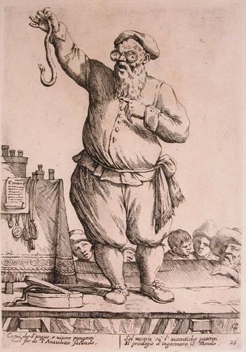 Il Ciarlatano e venditore di antidoti Il termine "ciarlatano" per indicare genericamente ogni tipo di imbroglione e di impostore è puramente attestato in lingua italiana fin dai primi anni del cinquecento ed ha conosciuto una tale fortuna da migrare in tutta Europa.Nel vocabolario della Crusca del 1612 essi venivano infatti descritti come "coloro che per le piazze spacciano unguenti, o altre medicine, cavano i denti o fanno giochi di mano che oggi più comunemente dicesi Ciarlatani, ...da Cerreto, paese dell'Umbria da cui soleva in antico venir siffatta gente, la quale con varie finzioni andava facendo denaro". La letteratura del cinque - seicento, è piena di aneddoti su questo argomento, ed addirittura furono composte delle opere a stampa, tra le quali lo "Speculum Cerretanorum" di Teseo Pini e "Il vagabondo ovvero sferza dà i vagabondi" di Raffaele Frianoro. Questo mestiere fu proibito dalle autorità dell'epoca e dal collegio dei Medici di Perugia nel 1577 che interdì la loro professione cerusica. Anche il Machiavelli usa il vocabolo "Cerretano" come sinonimo di medico ciarlatano, di finto medico, che vanta specifiche virtù nella sua famosa commedia "La Mandragola". Mons. Teseo Pini elenca già nel quattrocento 39 specializzazioni dei cerretani, alcune tra venditori, impostori e questuanti. Si tramanda anche che i cerretani dialogassero tra loro con un vocabolario alquanto oscuro, proprio per non farsi comprendere dalla gente che cercavano di truffare. Tav.n.25 della serie nota come "Le Arti per la via". Carta Filigranata "Reverenda Camera Apostolica" mm 280x195 Autore : Giuseppe Maria Mitelli (incisore) Annibale Carracci (disegnatore)Editore : Gio Iacommo Rossi (stampatore)Anno di pubblicazione : 1660 Note dell'Autore