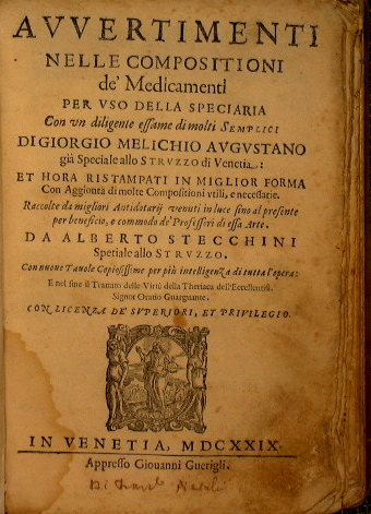 Avvertimenti nelle composizioni dei medicamenti per uso della Speciaria Speziale di Venezia, nato probabilmente ad Augusta (Germania), fiorito nella seconda metà del sec. XVI. Studioso di storia della farmacia e della medicina, titolare per un lungo periodo della farmacia allo Struzzo di Venezia. Questa farmacia, conosciuta in tutta l'Europa rinascimentale per le sue preparazioni magistrali, è la principale commissionaria della teriaca preparata in quella città . Tutta la sua arte e stata trasferita nell'opera Avvertimenti nelle composizioni de Medicamenti per uso della Speciaria, data alle stampe per la prima volta nel 1575. La ristampa più ricca e completa è quella del 1720, che contiene le aggiunte del nuovo titolare della Farmacia allo Struzzo, Alberto Stecchini, unitamente al trattato del medico-chimico d'Horatio Guarguante di Soncino (piccolo borgo vicino a Milano), nato a Cremona nel 1554 e morto nel 1611, sulle virtù della Teriaca. Il discorso introduttivo di Giorgio Melichio traccia la figura del "buono speciale", toccando diversi punti che vanno dall'etica professionale alla preparazione scolastica e all'igiene delle persone e degli ambienti. La prima dote delllo speziale è di avere "timore di Dio e carità verso il prossimo" e "fare con ogni sincerità la sua arte". Il Melicchio conclude tracciando quali sono i vizi dello "i vizi dello speziale" che lo inducono in errore offuscandone la mente ed impedendo la diligenza nelle preparazioni: l'ubriachezza, la lussuria ed il gioco delle carte. Autore : Giorgio MelichioEditore : Giacomo VincentiAnno di pubblicazione : 1595 Vinegia Note dell'Autore