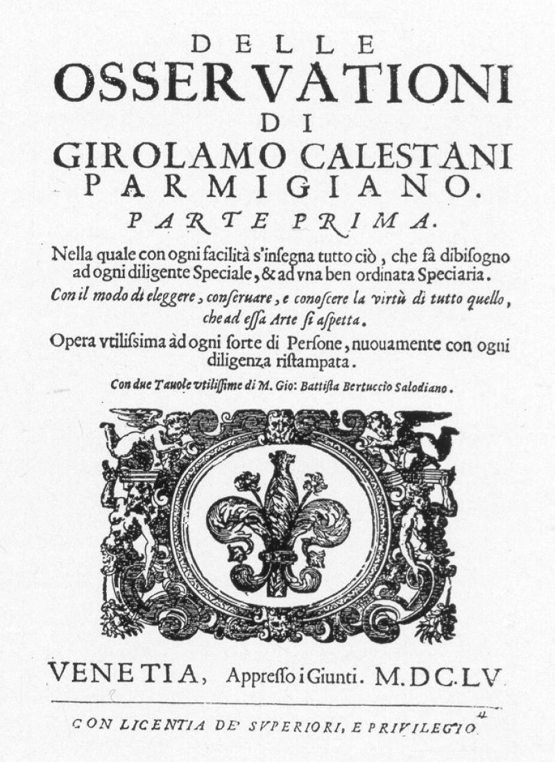 Delle Osservazioni di Girolamo Calestani Spezierie del '600 di cui si hanno scarsissime informazioni. Autore di un compendio intitolato "Delle osservazioni" che riscontrò un vasto eco in tutto il '700. L'opera è divisa in due parti ed è arricchita da elenchi (tavole) in cui sono riportati i "Nomi degli Auttori antichi et moderni". Nelle tavole troviamo un ricco elenco di medici, alchimisti, speziali, botanici e storici della materia, lasciando intravedere l'imponente studio che l'autore ha sicuramente fatto per redigere l'opera stessa.Il libro qui raffigurato presenta i capilettera acquerellati e alcune note dell'epoca. Autore : Girolamo CalestaniEditore : GiuntiAnno di pubblicazione : 1655 Note dell'Autore